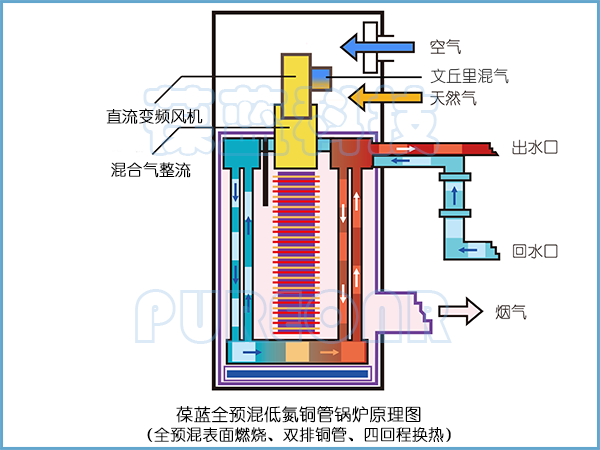 葆藍翅片銅管鍋爐四回程即使式換熱結(jié)構(gòu),燃燒室、次冷凝室、主冷凝室三室分離結(jié)構(gòu),壽命超長,導熱快,加熱精準。